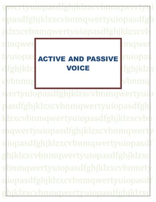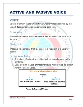This document discusses active and passive voice in English grammar. It defines active voice as having a subject that performs the action of the verb, while passive voice has a subject that receives the action. The document provides rules for forming passive voice and examples comparing active and passive forms in present, past, and future tenses. Passive voice is formed using auxiliary verbs like "is", "was", "will be" followed by the past participle of the main verb.