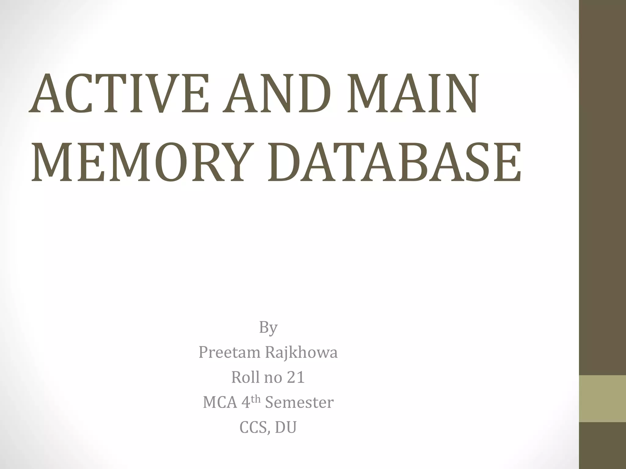 Active databases automatically respond to events inside or outside the system using rules. Main memory databases reside permanently in main memory for faster access than disk-based databases. Active databases support event detection and rule-based responses, while main memory databases have direct memory access without disk overhead. Both have applications in real-time systems where speed is critical.