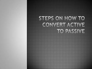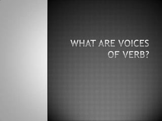 This document defines and differentiates between the active and passive voices. It states that the active voice is more common and has the subject performing the action on the object. The passive voice has the object as the subject receiving the action. It provides examples of converting between active and passive sentences by changing which element is the subject and object.