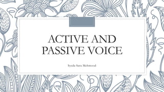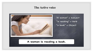 The document discusses the active and passive voice in English grammar. It provides examples of sentences in the active voice and their equivalent passive transformations. Some key points covered include:
