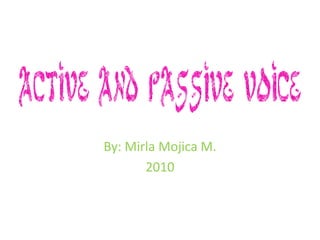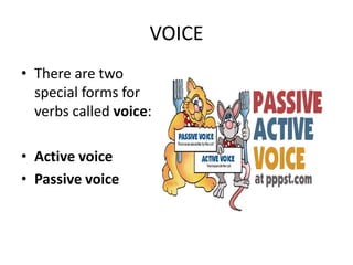The document explains the concepts of active and passive voice in verbs, highlighting that active voice is the most commonly used form where the subject performs the action, while passive voice is applied when the subject receives the action. Passive voice construction involves using a subject, an auxiliary verb (be), and a main verb in past participle form. The document provides examples and notes that passive voice can be conjugated in various tenses, although the lesson focuses on the simple tense.