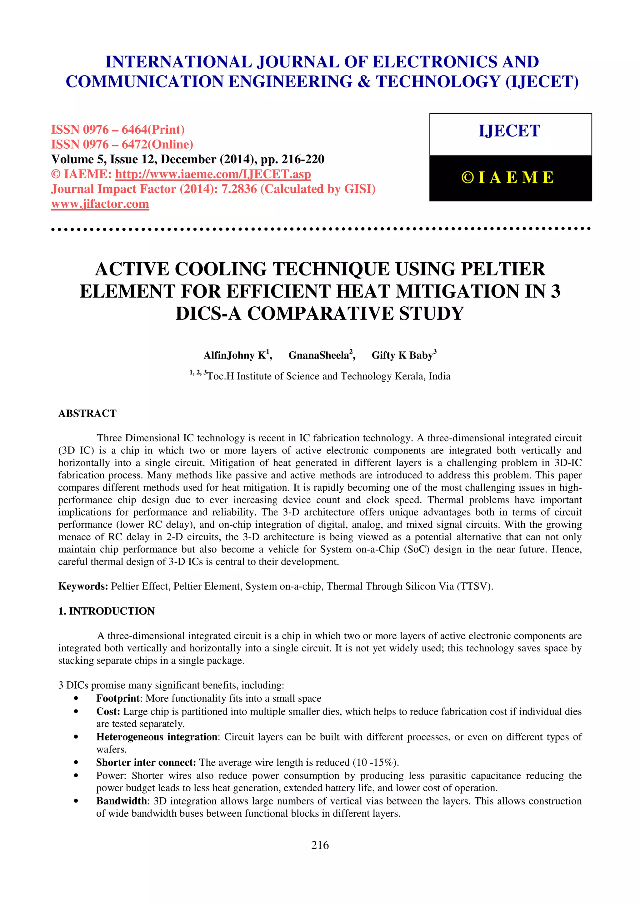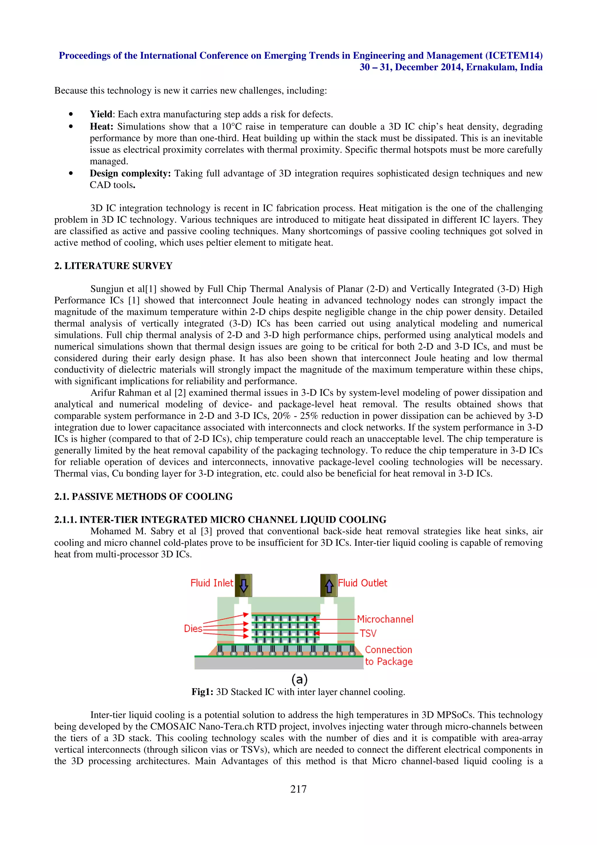 The document discusses the challenges and methods of heat mitigation in three-dimensional integrated circuits (3D ICs), highlighting the advantages of 3D architecture over traditional 2D circuits. It presents a comparative study of various active and passive cooling techniques, specifically focusing on the use of Peltier elements and innovative cooling methodologies like micro-channel liquid cooling. Effective thermal management is deemed crucial for enhancing performance and reliability as device density and clock speeds increase in modern chip designs.
