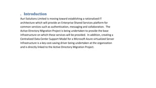 Auri Solutions is moving to establish a shared IT infrastructure platform for authentication, messaging, and collaboration. To support this, the company is undertaking an Active Directory Migration Project to consolidate its existing Active Directory domains and migrate them to a new centralized infrastructure hosted on Microsoft Azure. This project aims to gather information on the current Active Directory setup, review consolidation approaches and risks, and generate a report recommending a high-level consolidation plan, required activities, timeline, and tools.