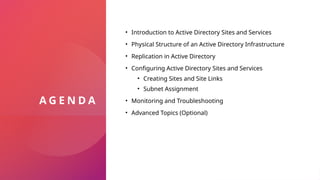 #4 This slide covers the basics of Active Directory sites and domains. We'll discuss domains and their relation to sites, the role of domain controllers, how sites are created and configured, and the function of site links in connecting sites and replicating data.