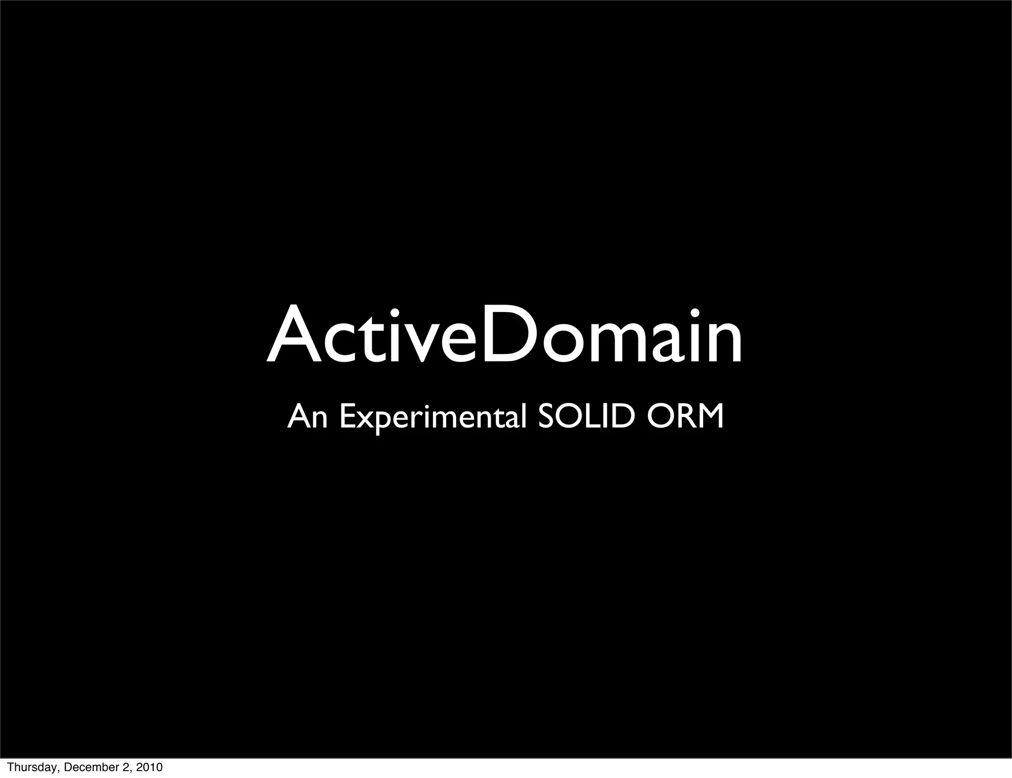 The document introduces ActiveDomain, an experimental ORM that aims to implement SOLID principles. It discusses issues with current ORM implementations, such as separation of concerns and efficiency. ActiveDomain uses plain Ruby objects and a unit of work pattern to address these issues. It maps domain entities to repositories and allows persisting objects to a database independently of the specific database. The document provides examples of using ActiveDomain to define a User entity with a has_many association to posts and persisting objects to a database. However, it notes that associations are not fully implemented yet and more work is needed before ActiveDomain is ready for use.