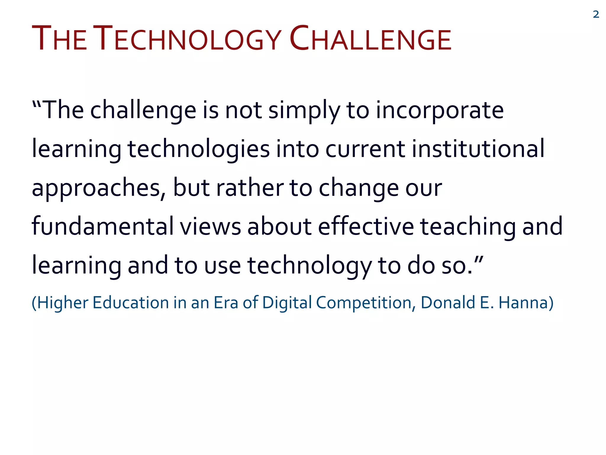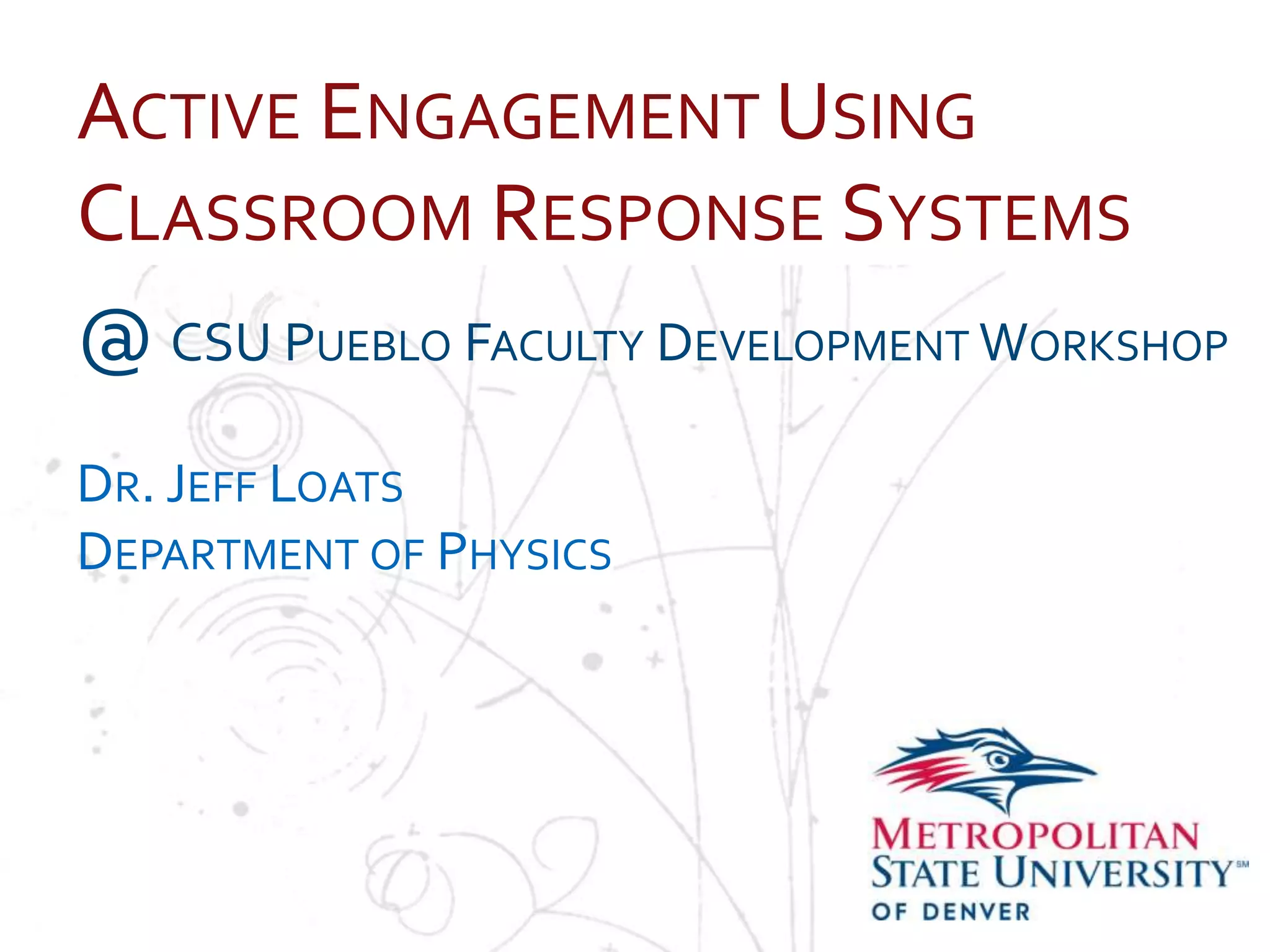 This document discusses the use of classroom response systems, also known as clickers, to promote active engagement in university courses. It provides an overview of techniques like peer instruction and thought questions that can be used with clickers. The evidence suggests that clickers help students learn and perform better on assessments by encouraging participation and concentration. While clickers are effective, the presenter emphasizes that pedagogical techniques are more important than the technology itself, and instructors should start small and focus on conceptual understanding over factual recall.