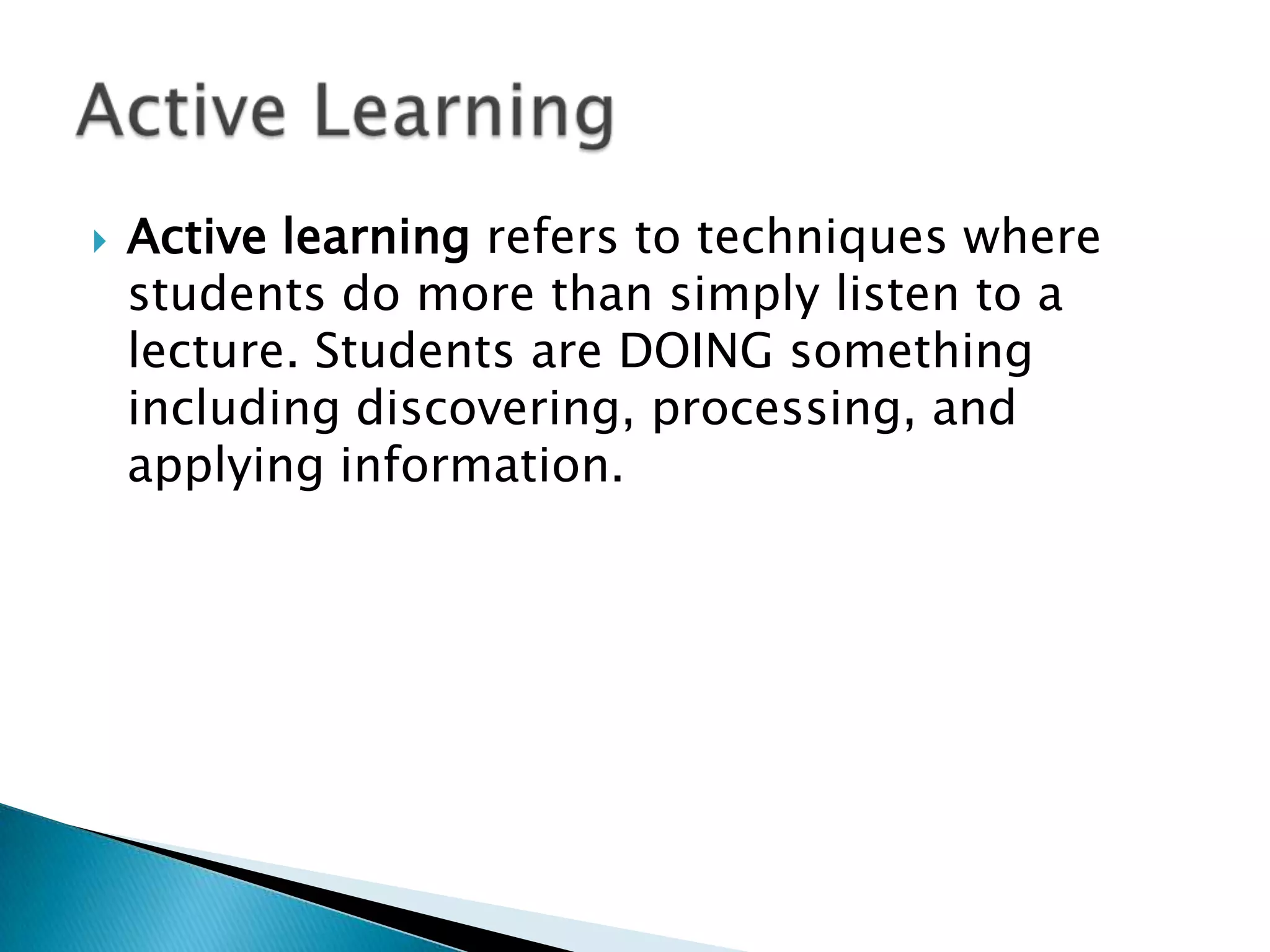 The document discusses active learning techniques that engage students in higher-order thinking. It defines active learning as involving students in activities like discussion, problem-solving, and group work that get them interacting with lecture material rather than passively listening. Active learning is based on the assumptions that learning is active and different people learn differently. Examples of active techniques provided include think-pair-share, debates, and analyzing case studies. The document recommends breaking up lectures with these activities to maintain attention and encourage deeper learning.
