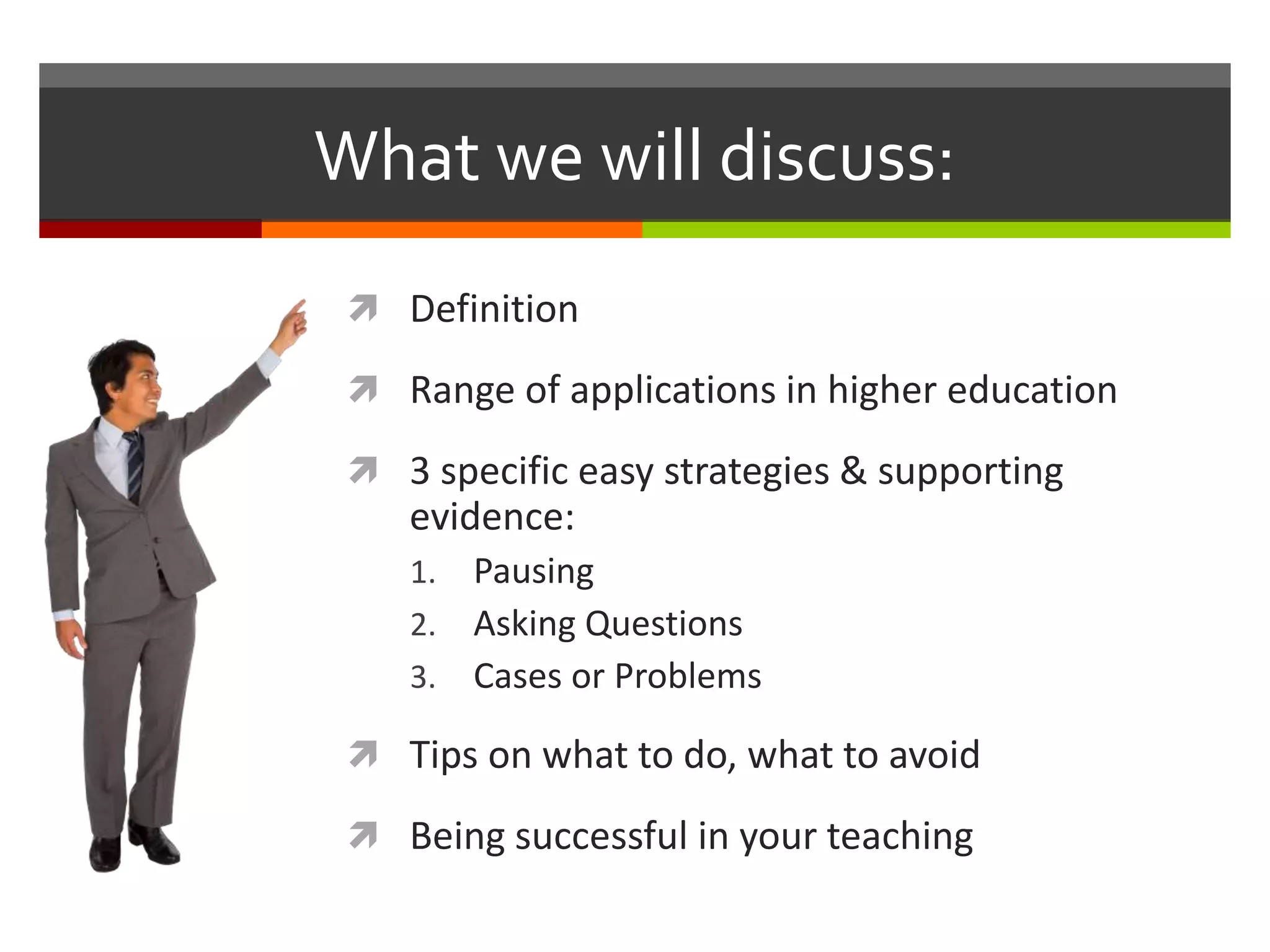 The document outlines active learning strategies for higher education, emphasizing three key methods: pausing lectures, asking questions, and using case studies or problems. Each strategy includes practical tips and supporting evidence demonstrating their effectiveness in improving student engagement and understanding. Key takeaways highlight the importance of preparation, anticipation of student difficulties, and gradual implementation of these strategies.