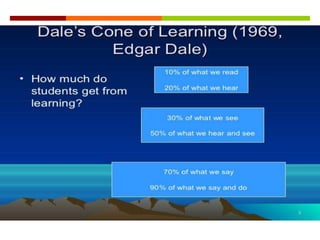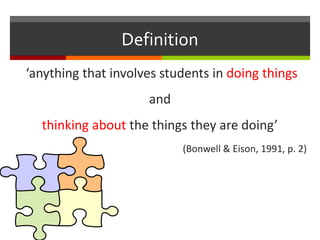 Active learning refers to techniques where students are actively engaged in the learning process through activities like discussion, problem-solving, presentations, and group work. It is based on the assumptions that learning is an active process and people learn in different ways. Some goals of active learning include developing communication and collaboration skills as well as encouraging student responsibility for learning. Examples of active learning methods include think-pair-share, collaborative learning groups, games, and student debates. Research shows that active learning is more effective than passive listening, as it increases the effectiveness and efficiency of teaching while providing opportunities for students to apply skills and explore their own thinking.