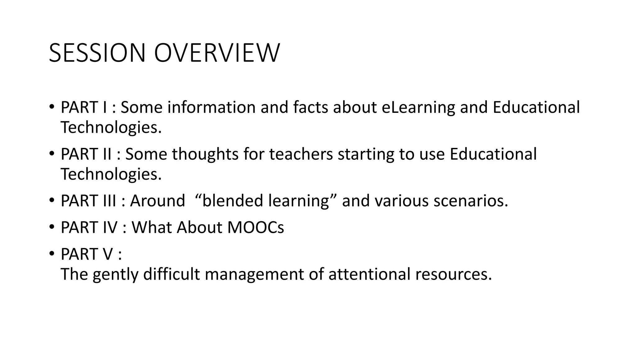 This document provides an overview of a presentation on teaching with educational technologies. It discusses key facts about eLearning and how students learn. It emphasizes that technology alone does not improve learning and that pedagogy is most important. The TPACK framework is introduced to help teachers integrate technology effectively. Blended learning models and scenarios are described. Guidelines are provided for using multimedia and managing attentional resources. Video is discussed as a tool to illustrate concepts before, during and after class.