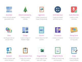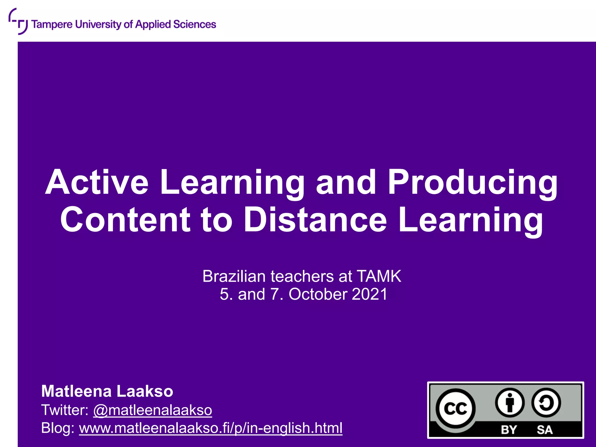 This document contains the agenda and materials for two online workshops for Brazilian teachers on active learning and producing content for distance learning. The first workshop on October 5th focuses on active learning techniques like word clouds, quizzes and polls. The second workshop on October 7th covers open educational resources, producing content with tools like H5P and ThingLink, and giving teachers time to create their own materials. The document provides detailed instructions and examples for various interactive online tools that can be used to engage students in distance learning.