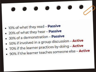 The document outlines various strategies for building a classroom community and promoting active learning through group activities, discussions, and vocabulary pre-teaching. It emphasizes the importance of engaging students in their learning process by drawing on their background knowledge and encouraging collaboration. Several specific activities and resources are suggested to facilitate these learning experiences.