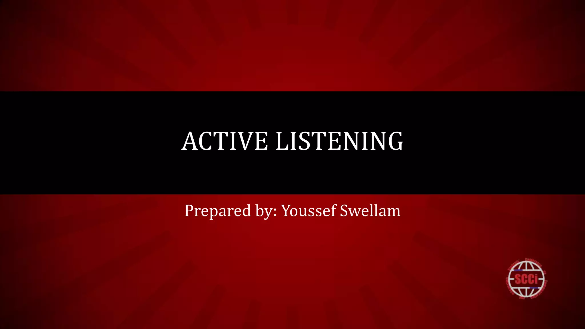 The document discusses how to be an active listener. It recommends paying attention to the speaker, showing that you are listening through nodding and eye contact, providing feedback by paraphrasing and asking questions, responding appropriately without judgment, and breaking bad listening habits to truly hear what the other person is saying. The overall goal of active listening is to obtain information, understand others, and learn.