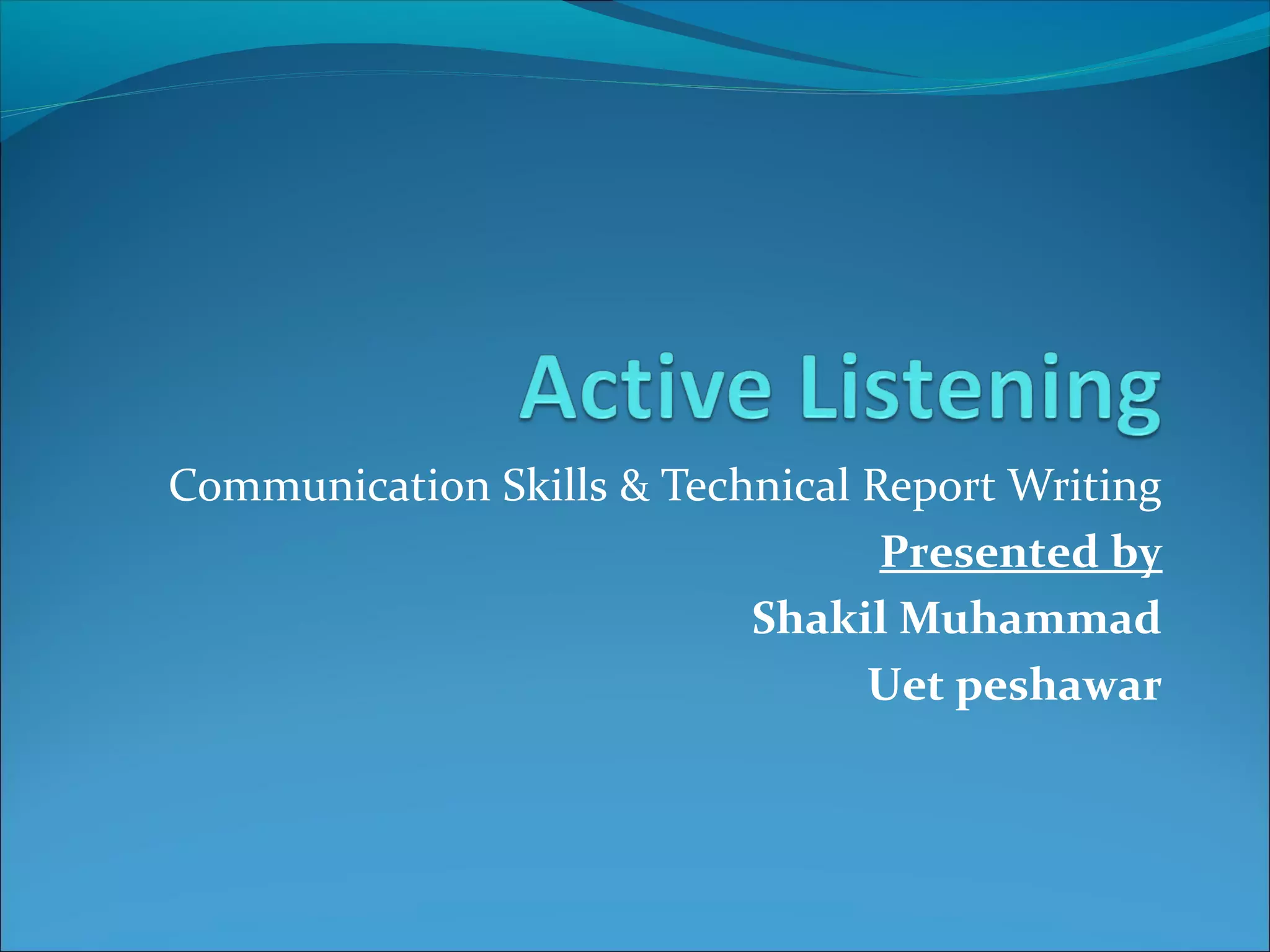 This document discusses effective listening skills. It defines listening as receiving, interpreting, and reacting to messages from a speaker, which requires voluntary attention. There are different types of listening like appreciative, empathetic, comprehensive, and critical listening. Good listening traits include being non-evaluative, paraphrasing, reflecting implications and hidden feelings, and inviting further contributions. Active listening involves concentrating fully, while passive listening is unconscious. Effective listening improves communication and productivity in organizations.