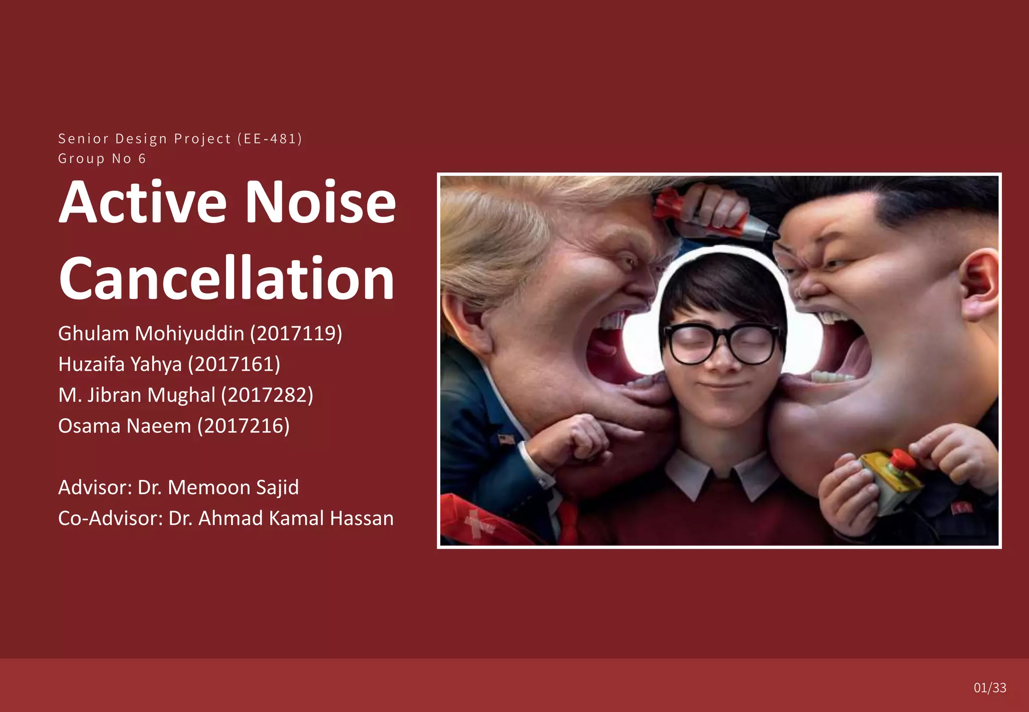 The document discusses the development and implementation of an active noise cancellation (ANC) system aimed at reducing unwanted noise in various environments. It outlines different types of noise cancellation methods, evaluates performance of several algorithms, and highlights the choice of the normalized least mean square (NLMS) algorithm for its real-time processing capabilities. The project concludes with successful hardware implementation of the NLMS algorithm on a DSP board, achieving significant noise attenuation.