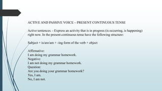 The document discusses the present continuous tense in both active and passive voice. It provides examples of affirmative, negative, and interrogative sentences in the active voice and explains how to change them to the passive voice. For active sentences, the structure is subject + is/are/am + -ing form of the verb + object. For passive sentences, the structure is object of the active sentence + is/are/am + being + past participle form of the verb + by + subject of the active sentence. The document also provides exercises changing sentences between active and passive voice.
