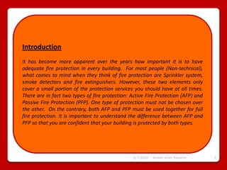 Active and passive fire protection work together to protect buildings from fire. Active fire protection requires action, like sprinklers or fire alarms, to suppress fires. Passive fire protection aims to contain fires, through components like fire-resistant construction, compartments, and doors. Both types of protection are needed for full fire safety. Other important life safety elements include emergency lighting, signage, evacuation procedures, and fire drills. Adhering to the latest fire codes and standards helps ensure buildings and occupants are adequately protected.