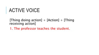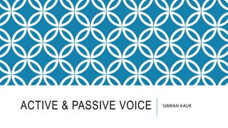The document discusses the active and passive voice in English grammar. It provides rules for forming the passive voice for all tenses except the present perfect continuous, past perfect continuous, future continuous, and future perfect continuous tenses. Examples are given for simple sentences in active and passive voice for tenses like present, past, future, present perfect, past perfect, and future perfect. The passive voice is also discussed for imperative sentences and modal verbs.