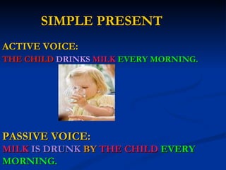 The document discusses the active and passive voices in different tenses in English grammar. It provides examples for each tense in the simple present, past, and future, present and past continuous, present perfect, past perfect, and future perfect tenses. For most tenses, both the active and passive voice examples are given, with some tenses like the future continuous and perfect continuous not having a passive form.