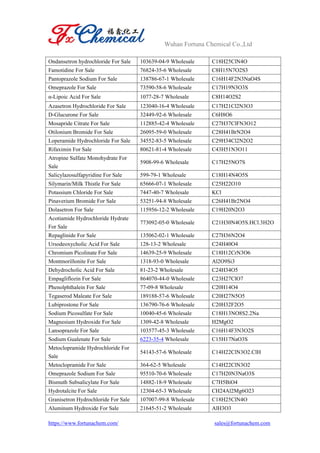 Wuhan Fortuna Chemical Co., Ltd specializes in the wholesale and bulk supply of active pharmaceutical ingredients (APIs), essential for drug formulation. The document lists various APIs used in treating digestive, blood, and cardiovascular system conditions, along with their chemical names, CAS numbers, and formulations. It emphasizes the importance of APIs in delivering effective therapeutic outcomes across multiple drug types.
