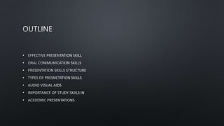 This document discusses how to improve presentation skills through effective structure and components. It recommends including an introduction that grabs attention, main themes that are relevant to the topic, and a summary/conclusion with key messages. Using audiovisual aids can make learning more effective by engaging multiple senses, but they may also cause technical problems or distraction. There are different types of presentations such as informative, arousing, persuasive, decision-making, and instructional.