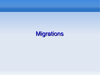 Migrations allow you to define and manage changes to your database schema over time. The document discusses ActiveRecord migrations, which provide a way to iteratively improve the database schema by adding, removing, and changing tables and columns. It also covers generating and rolling back migrations, common migration methods like create_table and add_column, and using migrations to support models and testing.