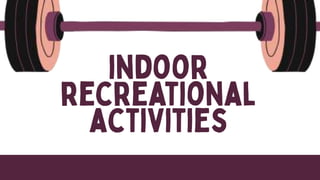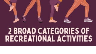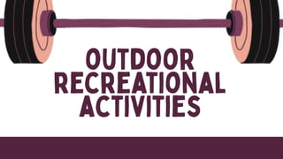 The document defines recreational activities and differentiates between indoor and outdoor activities. It explains that recreational activities can enhance physical fitness and lists examples of indoor activities like badminton, volleyball, dance and zumba, and outdoor activities like hiking, camping, cycling, and rafting. The document emphasizes the importance of participating in recreational activities for overall health, fitness, stress relief and lifestyle balance.