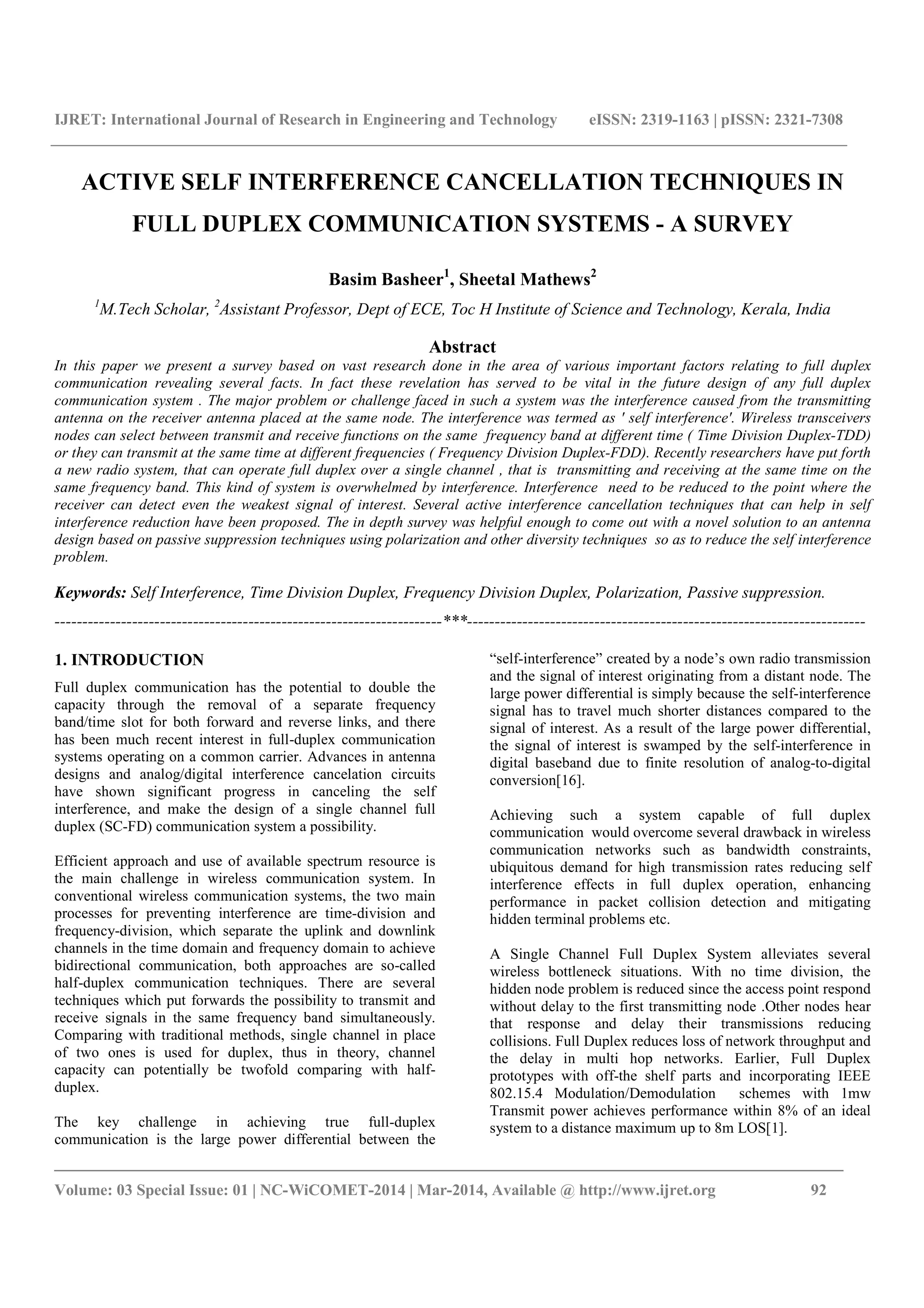 This paper surveys various active self-interference cancellation techniques in full duplex communication systems, which improve transmission efficiency by enabling simultaneous data transmission and reception on the same frequency band. The main challenge discussed is the interference caused by the transmitting antenna on the receiver antenna, referred to as 'self-interference.' Several proposed solutions include novel antenna designs and passive suppression techniques utilizing polarization and diversity to mitigate self-interference and enhance communication performance.