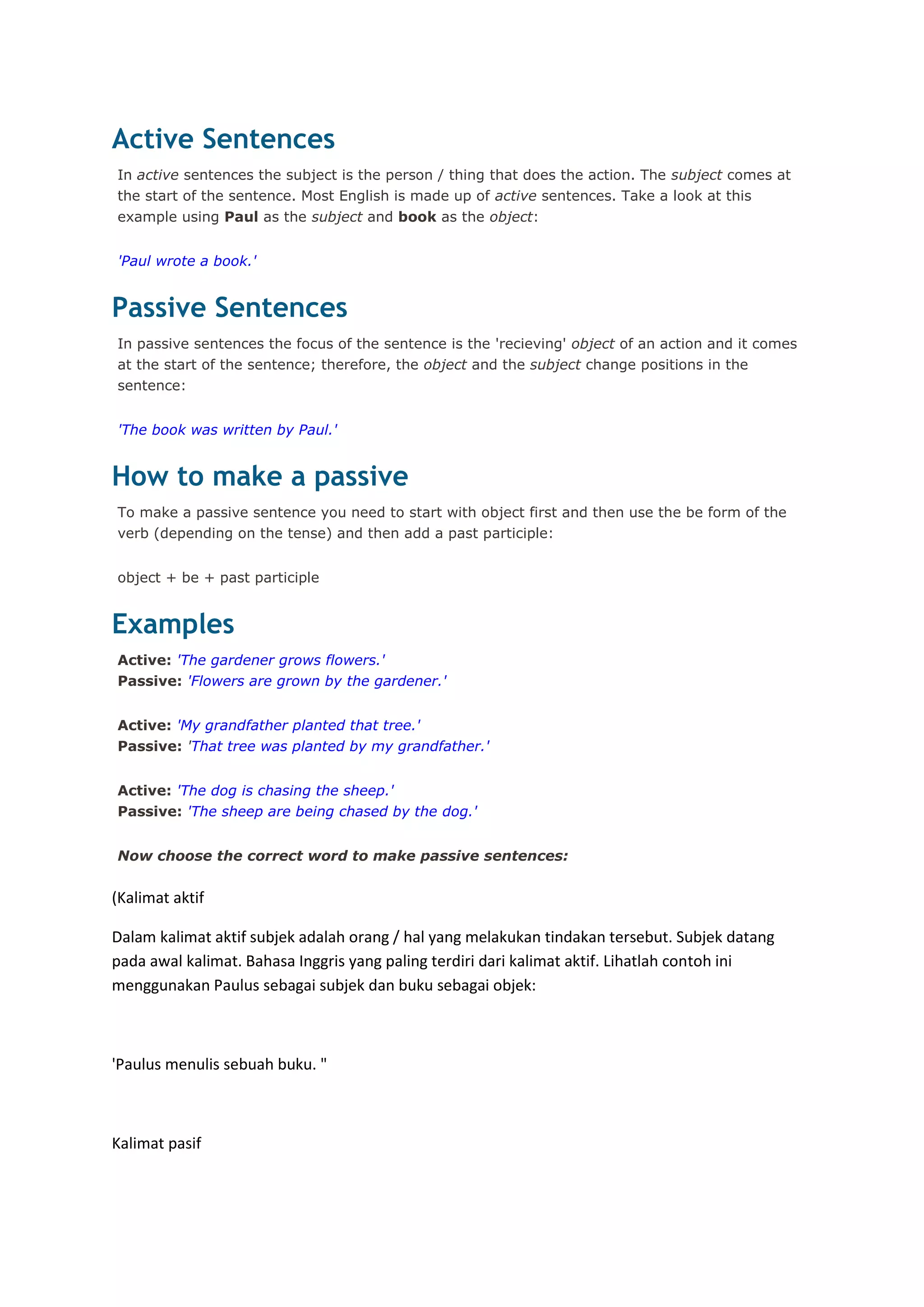 The document discusses active and passive sentences in English. It defines active sentences as having the subject perform the action of the verb, and passive sentences as having the subject receive the action of the verb. It provides examples of changing sentences from active to passive form by making the object the subject and using a form of "to be" plus the past participle of the verb. It also includes a table outlining how to change between active and passive forms for different English tenses.