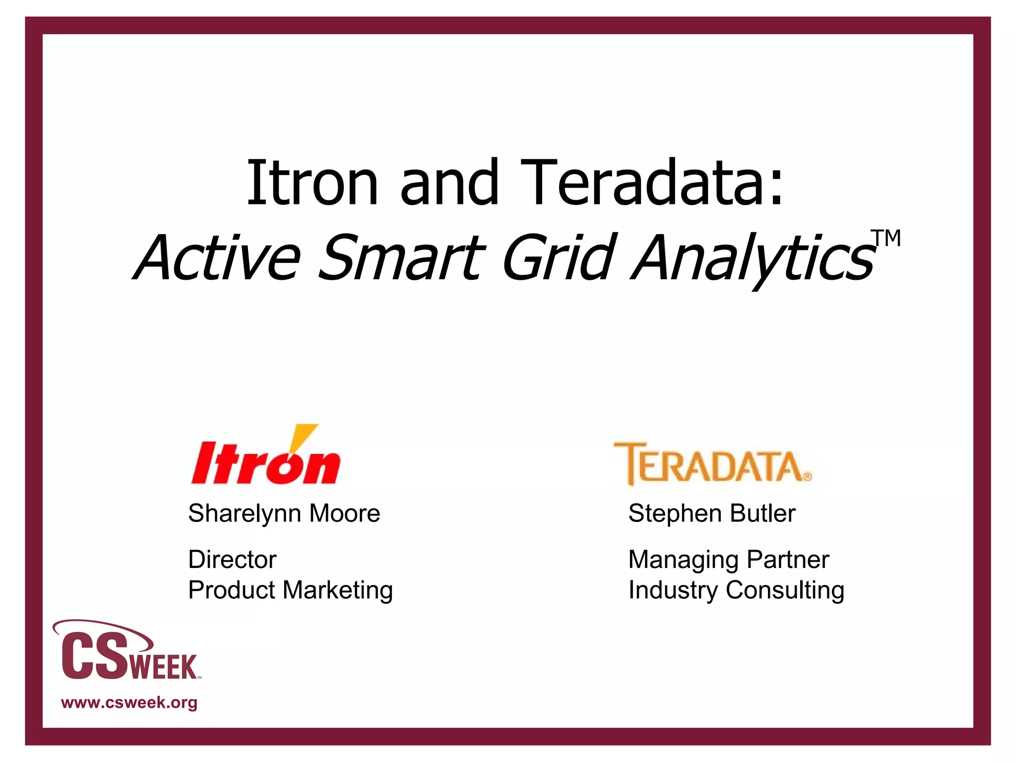The document discusses the collaboration between Itron and Teradata on the Active Smart Grid Analytics (ASA) platform, aimed at enhancing utility management through better data integration and analytics. It emphasizes the need for robust Advanced Metering Infrastructure (AMI) and Meter Data Management (MDM) systems as foundational technologies for optimizing operations and customer engagement. The proposed solution focuses on consolidating various data sources to improve decision-making and operational efficiency across the utility sector.