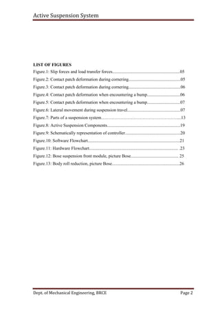 This document describes an active suspension system for a vehicle. It discusses the objectives and methodology of the project. The methodology section covers properties of suspension systems like spring rate, wheel rate, weight transfer, travel and damping. It describes the fundamental components of any suspension system including springs, dampers and anti-sway bars. It provides diagrams of typical suspension parts and the contact patch deformation during cornering and over bumps. The document outlines the chapters on literature review, objectives, active suspension design and functions. In conclusion, it presents the abstract which states that the active suspension system aims to improve ride comfort and handling by reducing sprung mass acceleration and suspension deflection.