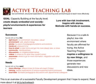 The Active Teaching Lab program provides low-commitment, structured explorations of teaching tools and techniques to help faculty teach more effectively. Faculty tell program organizers that they appreciate the light-touch, playful environment that allows them to learn from peers' experiences in a low-stress way through hands-on activities and discussions. Based on positive feedback, organizers plan to expand offerings to different times and provide deeper training on specific tools and processes to further inspire faculty to incorporate new approaches in their teaching.