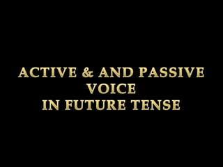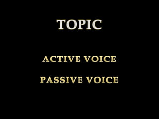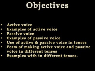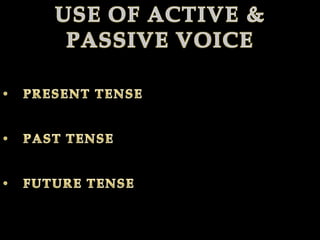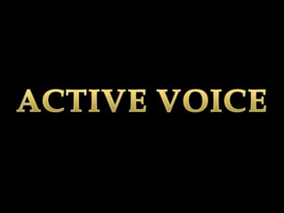 The document discusses active and passive voice in sentences. It provides examples of sentences written in active voice where the subject performs the action and examples of the same sentences rewritten in passive voice where the subject receives the action. It covers active and passive forms for sentences written in present, past, and future tenses.