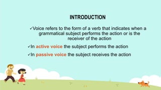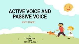 The document discusses active and passive voice in the past tense. It explains that active voice has the subject performing the action, while passive voice has the subject receiving the action. It then provides examples of sentences in the active and passive voice in three past tenses: past indefinite tense, past progressive tense, and past perfect tense. For each tense, it shows affirmative, negative, and interrogative examples in both active and passive voice, and provides additional examples to illustrate the differences.
