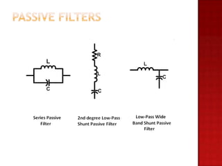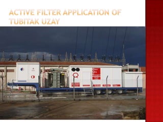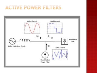 This document defines power quality and current harmonics. It discusses passive filters and active power filters, including voltage sourced and current sourced active power filters. Active power filters are compared to passive filters, noting active filters' advantages in eliminating any harmonics without tuning, but their higher cost and complexity. The document concludes by describing the Denizli-2 active power filter application in Turkey, which uses a current sourced converter design to filter 5th harmonics at a 5 MVA installation.