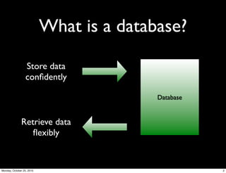 The document discusses ActiveRecord, an Object-Relational Mapping (ORM) framework for Ruby, providing a flexible approach for interacting with relational databases using Ruby objects without writing SQL directly. It covers how to create and manage database schemas using migrations, model definitions, and conventions in Rails applications, emphasizing the ease of use and integration with Ruby. The document also highlights versioning, migration management, and best practices when working with ActiveRecord to maintain data integrity and efficient database operations.