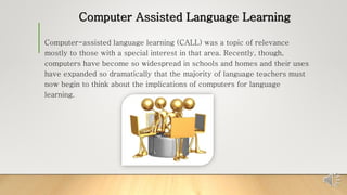This document discusses the history and evolution of computer-assisted language learning (CALL). It describes three phases: 1) behavioristic CALL from the 1950s-1970s focused on repetitive drills, 2) communicative CALL of the 1970s-1980s emphasized more authentic communication, and 3) integrative CALL from the last decade aims to integrate multimedia and the internet by combining text, graphics, sound, and video to facilitate language learning.