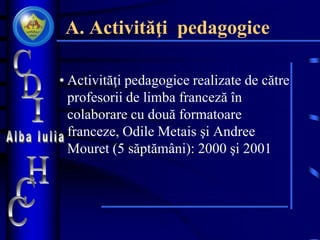 Documentul detaliază activitățile pedagogice desfășurate între 2000 și 2016 de profesorii de limba franceză în diverse proiecte educaționale. Aceste activități includ colaborări cu alte instituții, organizarea de concursuri, expoziții și proiecte tematice, toate având scopul de a stimula interesul elevilor pentru limbă și cultură. Pe parcursul anilor, s-au implementat diverse inițiative axate pe dezvoltarea competențelor de lectură, cunoaștere și respect în interacțiunile sociale.