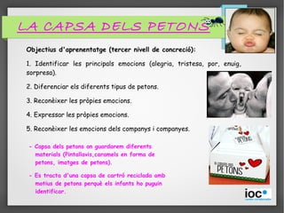 materials, farem una petita explicació de cada una de les emocions i, per acabar, farem preguntes als