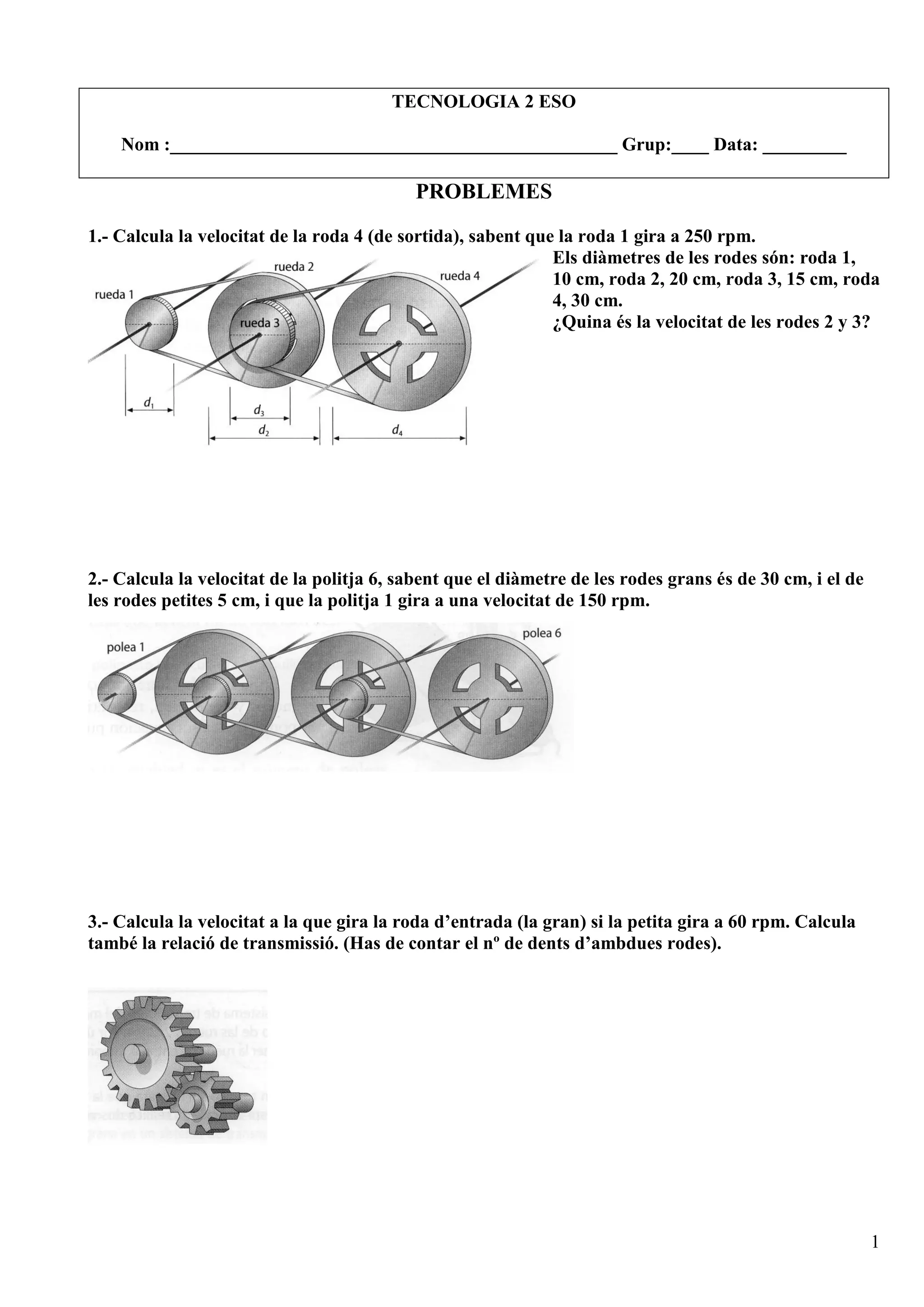 1.- Calcula la velocitat de la roda 4 (de sortida), sabent que la roda 1 gira a 250 rpm.