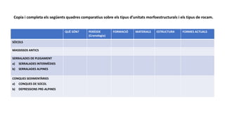Copia i completa els següents quadres comparatius sobre els tipus d’unitats morfoestructurals i els tipus de rocam.