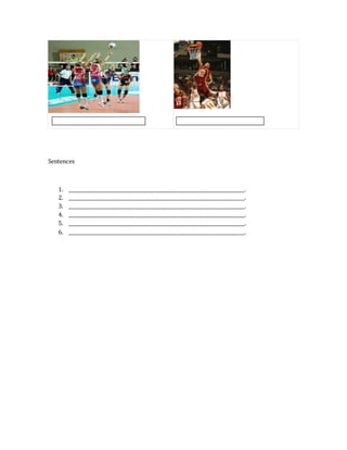 This document contains questions about sports and requests the reader to answer them, including what sport they do, their favorite soccer player and athlete/team, and how often they practice sport. It also asks the reader to name pictures from a video and write a sentence for each.