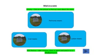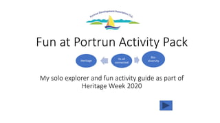 This document provides information and activities for exploring the heritage and natural environment of Portrun as part of Heritage Week 2020. It includes sections on the meaning of local place names, identifying local heritage sites and features, learning about biodiversity and protecting the natural environment. Activities encourage taking photos of heritage sites, drawing local plants and animals, and testing knowledge of Portrun. Upon completion, participants can become a solo explorer in Portrun and submit their work to receive a certificate.
