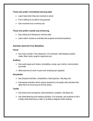 Students learn in different ways depending on their individual learning styles and sensory preferences. Some students learn best visually, others auditorily, kinesthetically, or tactilely. Teachers should identify each student's preferred learning style and incorporate activities that appeal to different modalities, such as visual displays, verbal instructions, physical activities, and hands-on projects. Psychologist Howard Gardner also theorized that people have at least seven distinct intelligences, including logical, visual, kinesthetic, musical, interpersonal, intrapersonal, and linguistic abilities, and teachers should design lessons to engage students' varied intelligences.