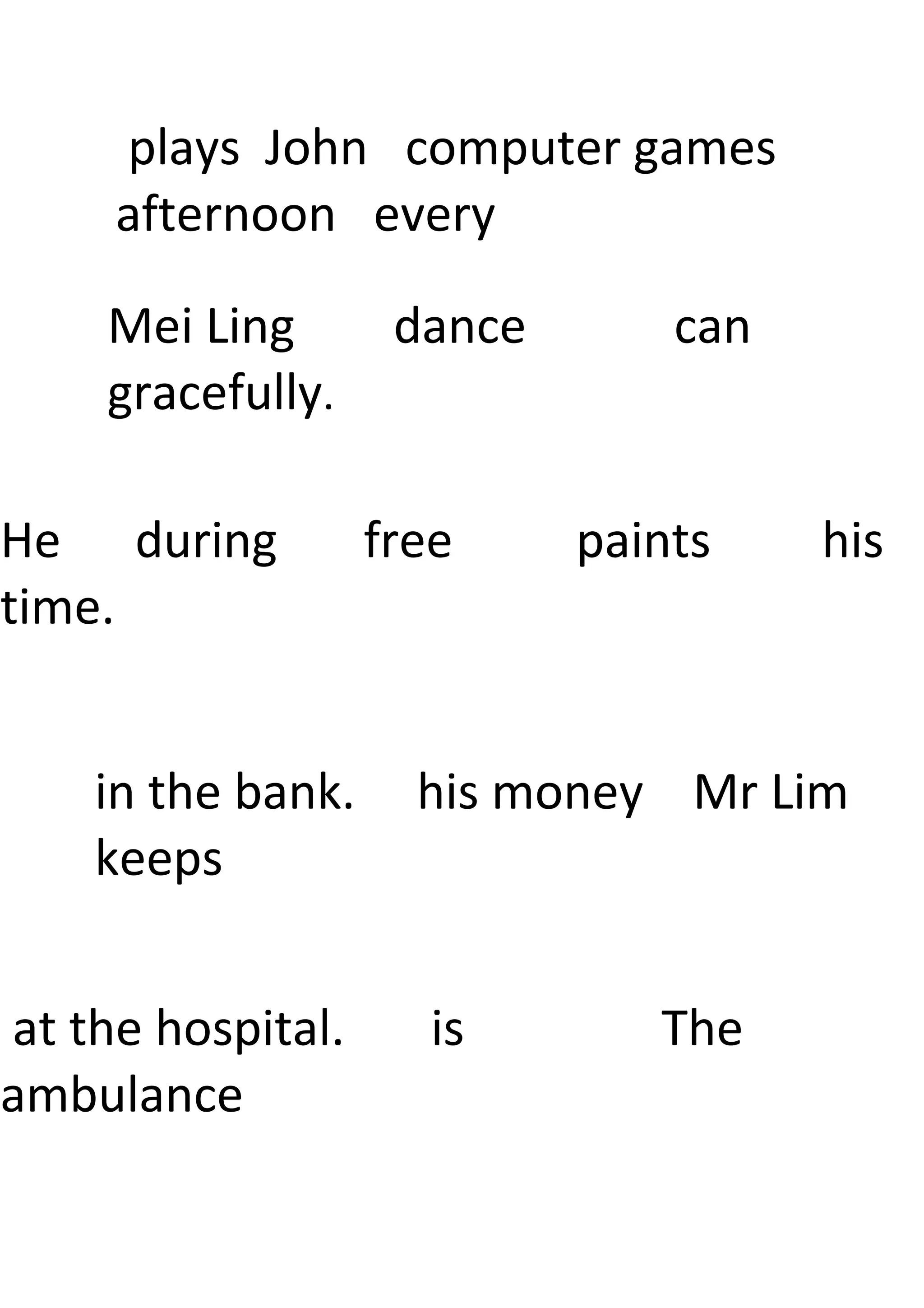 Mei Ling can dance gracefully. John plays computer games every afternoon during his free time. Mr Lim keeps his money in the bank and an ambulance is at the hospital.