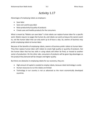 Robots have several advantages over human labor for businesses: they do not require wages, can work longer hours, and raise productivity and quality. This is because robots replace human labor for specific tasks. While employing robots benefits businesses and consumers through lower costs and higher quality products, it risks displacing human workers from those roles and requires significant capital investment due to the cost of robot technology. Developing countries also face obstacles due to having less advanced technology than more developed economies.