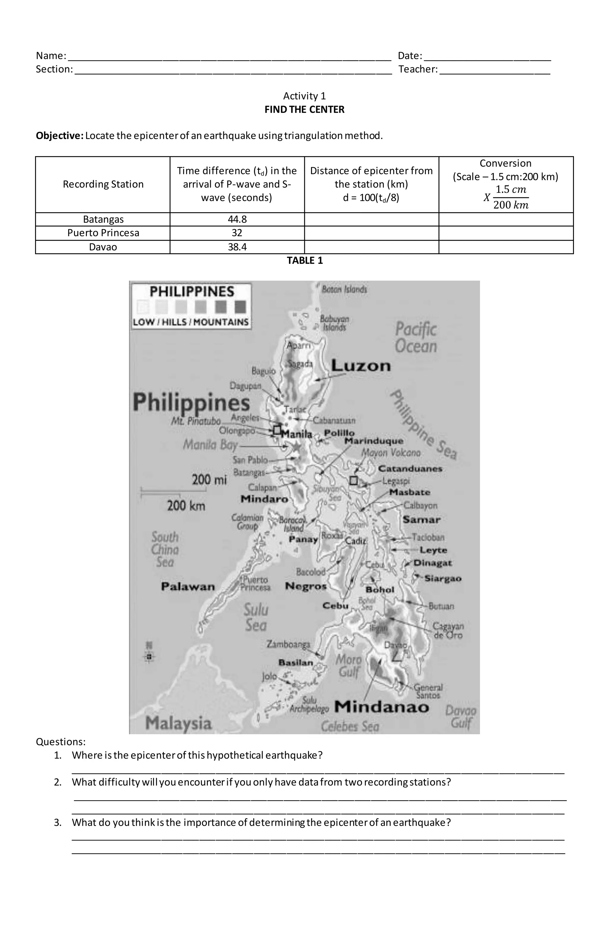 This document provides instructions and data for an activity to locate the epicenter of a hypothetical earthquake using triangulation based on data from three recording stations. The data includes the time difference between arrival of P and S waves and distance of the epicenter from each station. Students are asked to determine the epicenter location from the data, discuss difficulties with only two stations, and importance of determining epicenter locations.