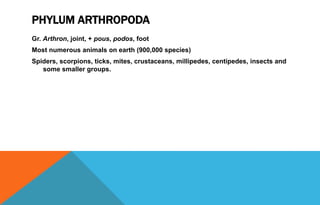 The phylum Arthropoda includes insects, spiders, crustaceans, and other joint-legged invertebrates. They have segmented bodies, jointed appendages, and an exoskeleton. Their body plans range from two tagmata to three tagmata. They exhibit a variety of modes of feeding, respiration, and reproduction. Major subphyla include Chelicerata (spiders, scorpions), Crustacea (crabs, shrimp), and Uniramia (insects, centipedes, millipedes).