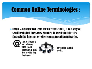The document defines common online terminology such as email, wiki, social bookmarking, HTML, podcast, VoIP, online chat, WWW, blog, social networking, URL, and web feeds. Email allows digital messages to be sent over the internet. A wiki is a website that allows collaborative editing. Social bookmarking services allow users to bookmark and share web pages. HTML is the language used to structure and present content on the world wide web. Podcasts are digital media files that can be automatically downloaded. VoIP delivers voice and video communications over the internet. [END SUMMARY]