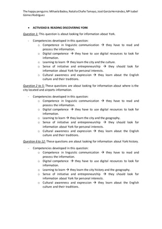 This document discusses activities from an English class that aim to develop various competencies. Activity 1 involves discussing topics in small and large groups, which helps develop communication skills, learning abilities, and social/civic awareness. Activity 2 requires students to create a statistical essay analyzing discussion results, combining communication skills with mathematical and analytical thinking. Activity 3 involves reading a text about York, England and answering questions to find information, developing skills in reading, digital literacy, learning, independent thinking, and cultural understanding.